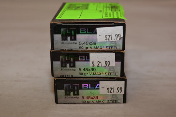 Lot of 3 boxes of Hornady Black Ammunition in 5.45 x 39MM, 60 grain, V-Max Steel, total of 60 rounds