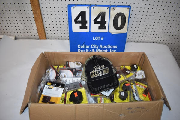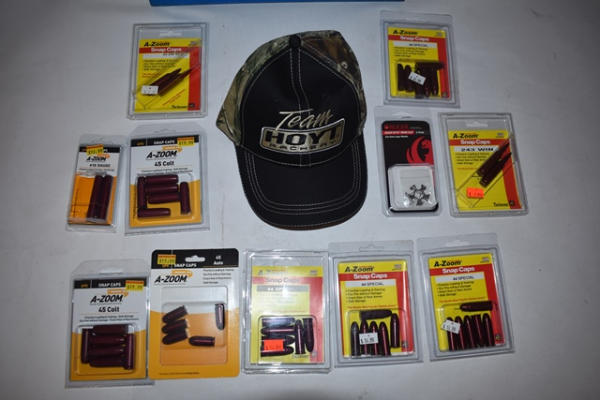Box lot including Team Hoyt Archery baseball cap, large number of snap caps in calibers including 45 Colt, 410 ga., 44 Special, 22-250 Rem, 243 Win. Also includes scope covers, brushes, etc.