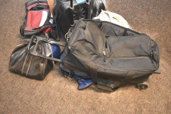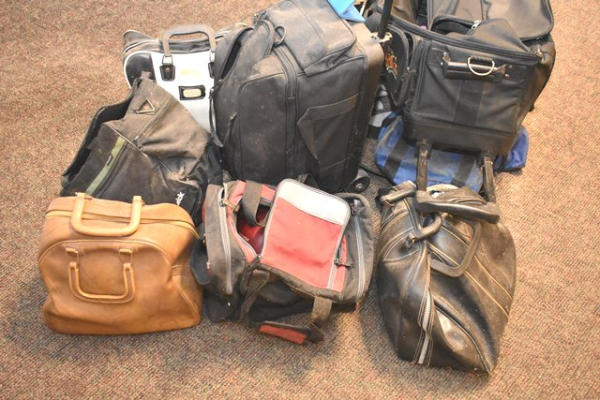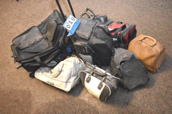 Lot of used bowling bags, some with bowling balls