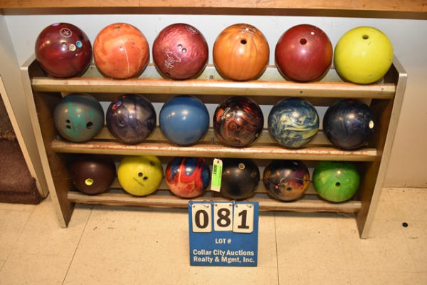 3-tier bowling rack with 18 bowling balls, approx. 58" long x 14" deep x 32" tall