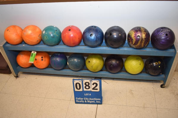 AMF bowling ball rack with 16 bowling balls, roll around