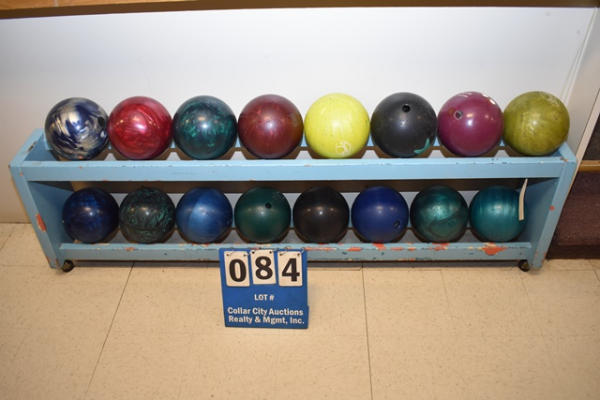 Bowling ball rack with 16 bowling balls, approx. 74" x 12"
