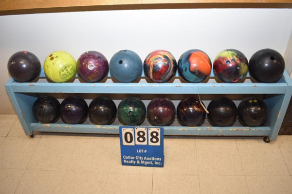 Bowling ball rack with 16 bowling balls, approx. 74" x 12"