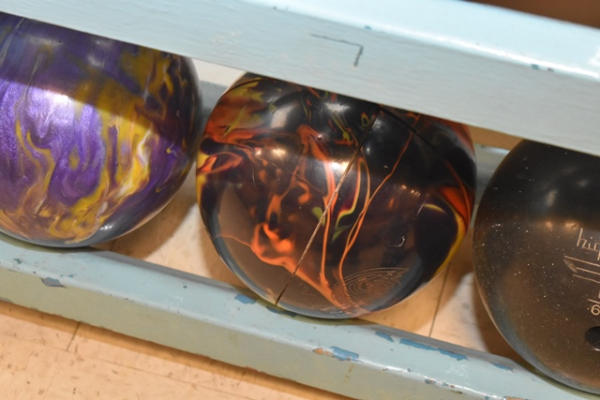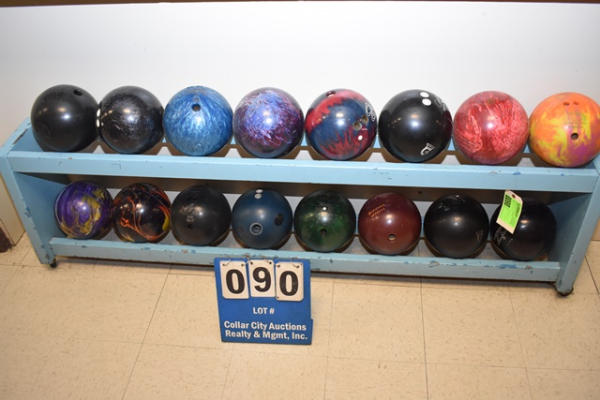 Bowling ball rack with 16 bowling balls, approx. 74" x 12"