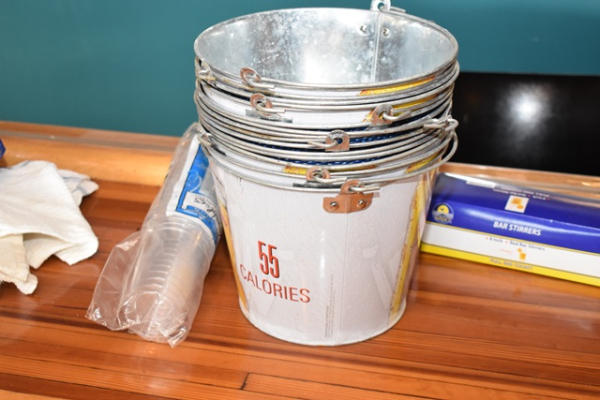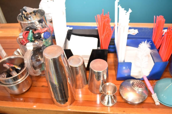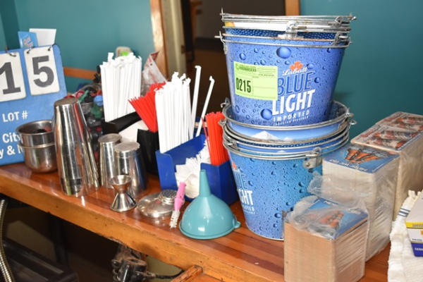 Large lot of bar accessories including mixing cups, straws, stirrers, buckets, coaster, etc.