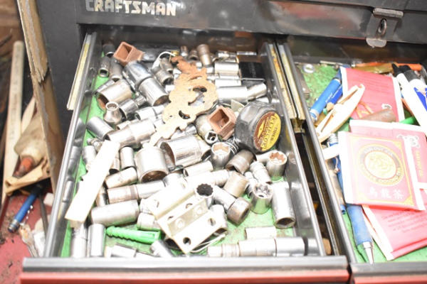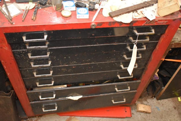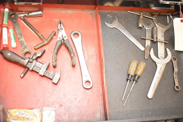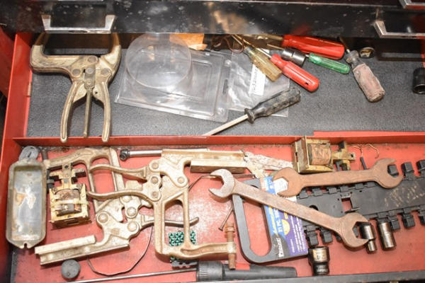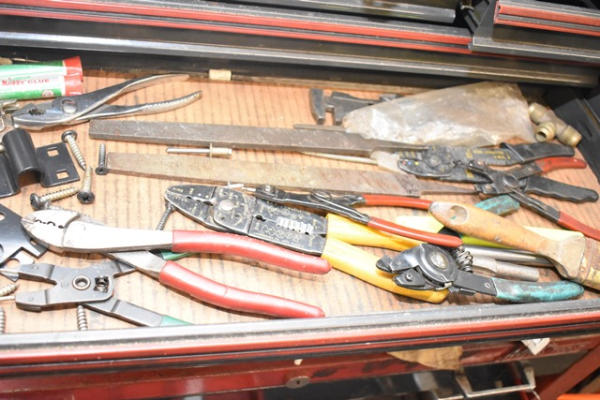 Toolbox with contents consisting of tools including crimpers, snap ring pliers, wrenches