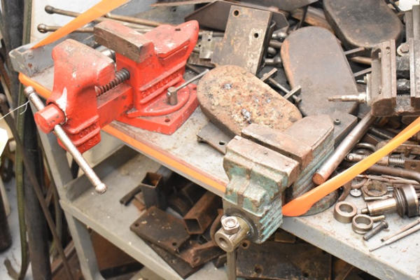 Roll around cart with vises and misc. parts