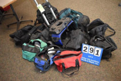 Large lot of used bowling bags, some have bowling balls and shoes