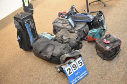 Large lot of bowling bags, some have bowling balls and shoes