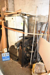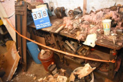 Lot of 2 work benches with assorted bracketry and a gear box