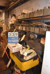Shelving unit with contents consisting of gear boxes, motor housings, brackets