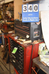 Toolbox with contents consisting of tools including crimpers, snap ring pliers, wrenches