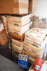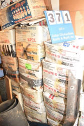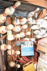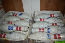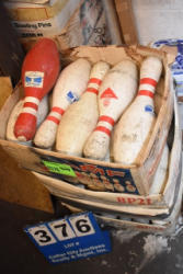 Lot of 3 cases of bowling pins, assorted bracketry, wheels, etc.
