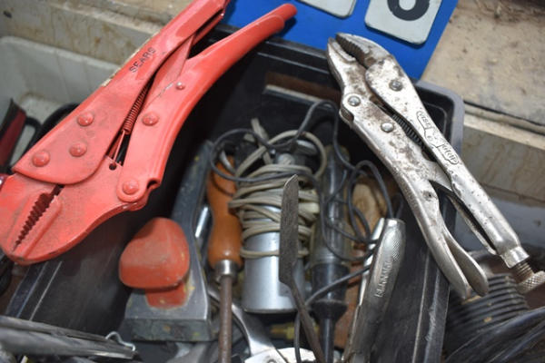 Box lot of tools consisting of vise grips, automotive tester, etc.