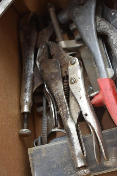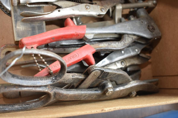Box lot of tools consisting of vise grips, punches, leather punch, tin snips, etc.