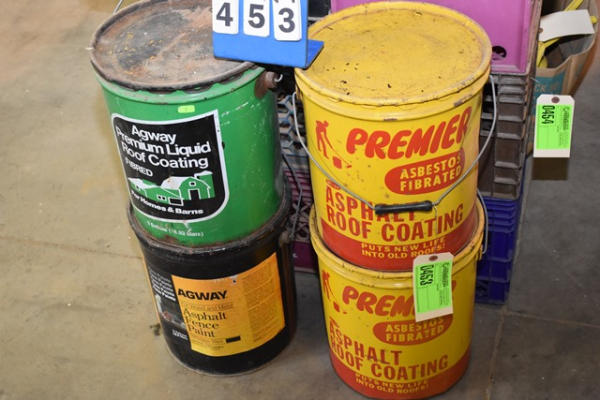Lot of asphalt roof coating, asphalt fence paint, and Agway Premium Liquid Roof coating (fibered)