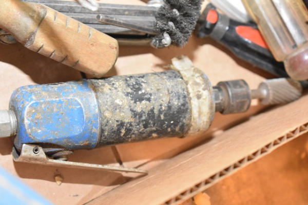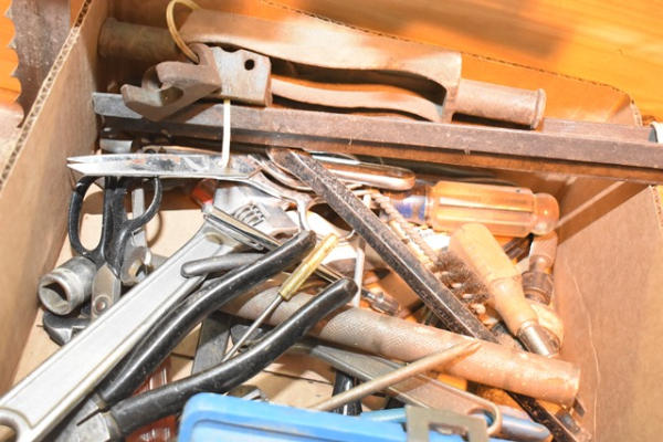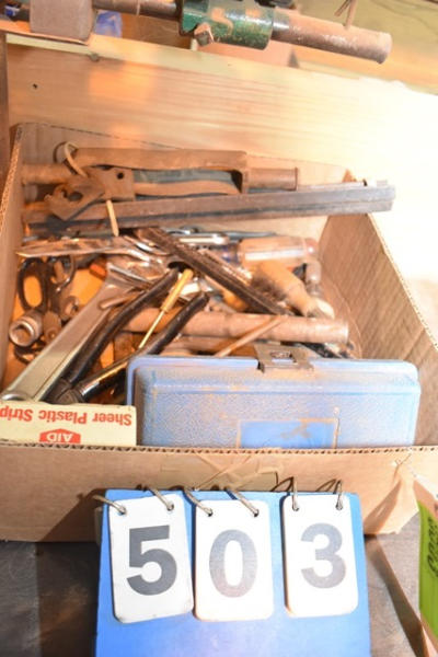 Box lot of tools including adjustable wrench, lineman pliers, screwdriver with bit set, pneumatic tools, etc.