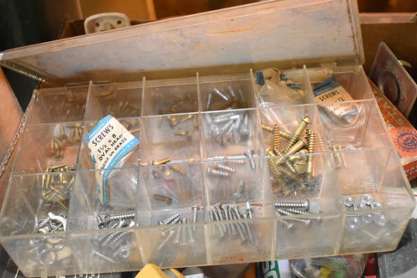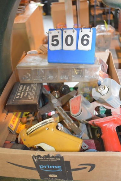 Lot consisting of staplers, screws, small nuts and bolts, office supplies, tape dispenser, etc.