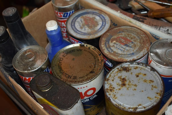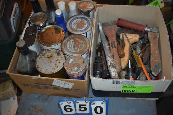 Box lot of tools including scrapers, screwdrivers, etc. Also included is a box of oil