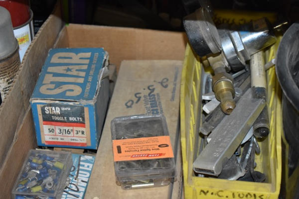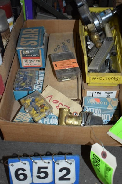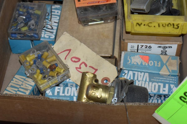 Box lot including Flomatic valves, electrical supplies, torch cleaner