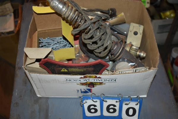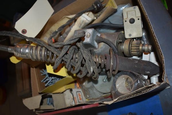 Box lot including electric soldering iron, machinist's screws, etc.