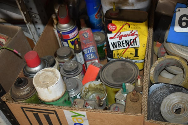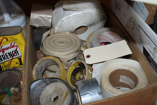 Lot of 2 box lots including tape, Liquid Wrench, WD40, etc.