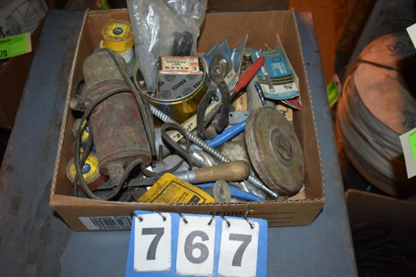 Box lot of tools including files, drill bits, tape measure