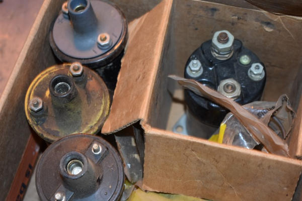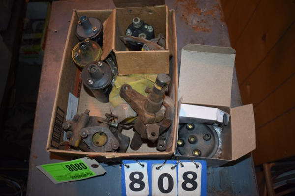 Box lot including coils, carburetor, distributor cap, etc.