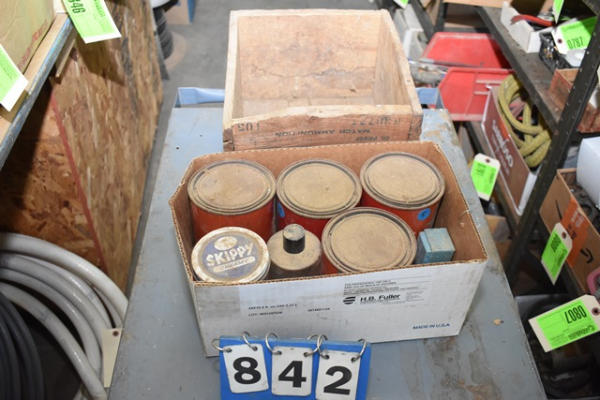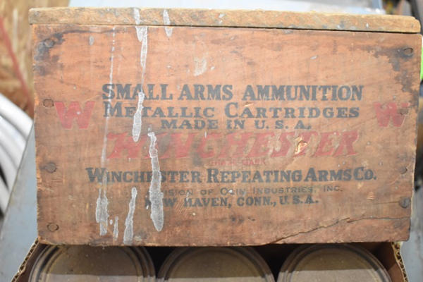 Nice Winchester 38 Smith & Wesson Special wood box, approx. 12" x 12" and cans of Mercury