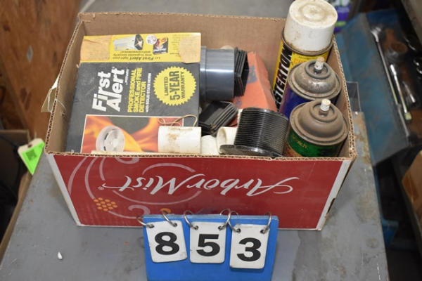 Box lot with smoke detector, PVC pipe fittings, fluids