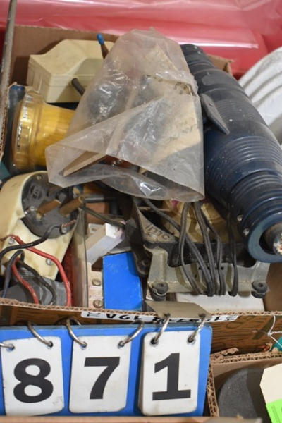 Box lot of electrical items including plugs, fan, door contacts, etc.