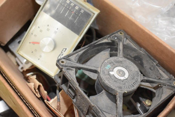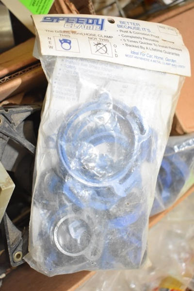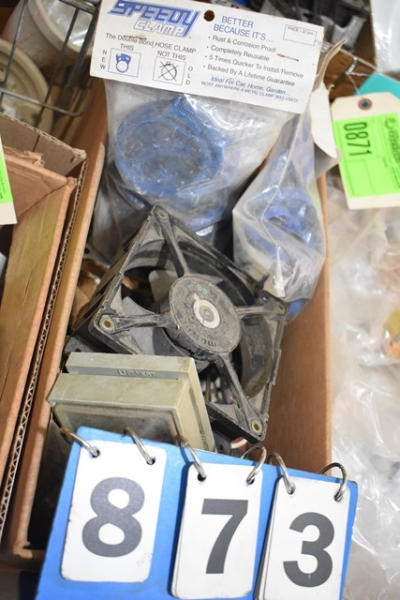 Box lot of assorted items including The Double Bond Hose Clamp, small fan, thermostat, etc.