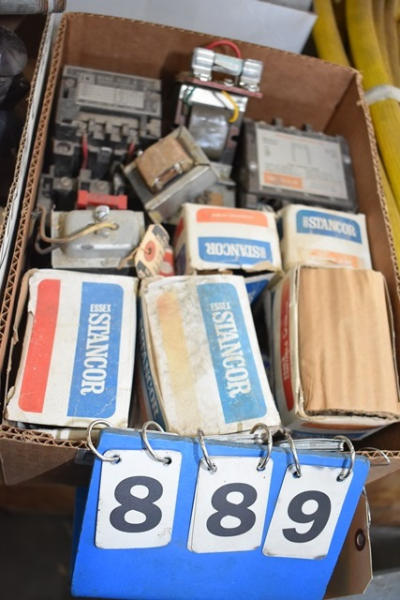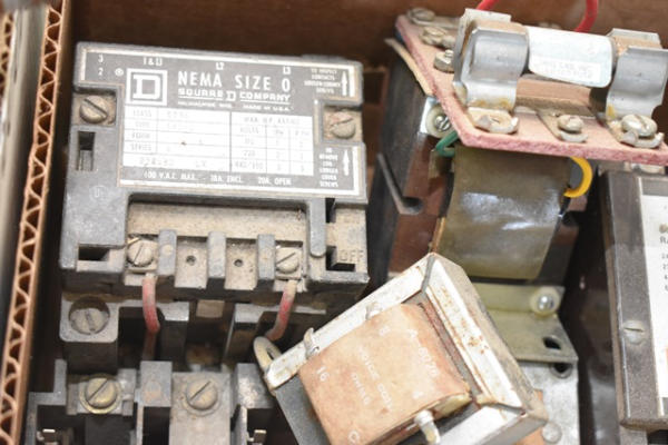 Box lot of electrical supplies including magnetic controller, transformers, breaker