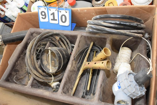 Box lot with hose, solenoid valve, large caulk guns, etc.