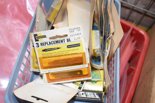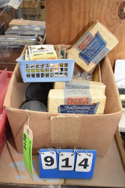 Box lot including sponges, shelf holding pins, Stanley replacement blades, o rings, etc.