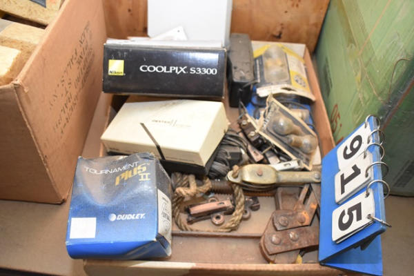 Box lot including Nikon Cool Pix Digital Camera, light bulbs, softball, etc.