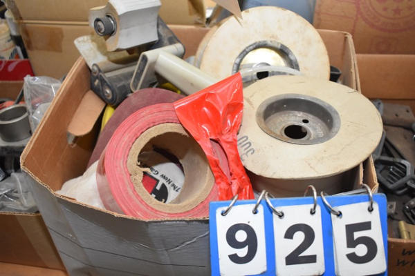 Box lot including red caution tape, danger tape, plastic wire loom, plastic edging, tape gun, hard hat, etc.