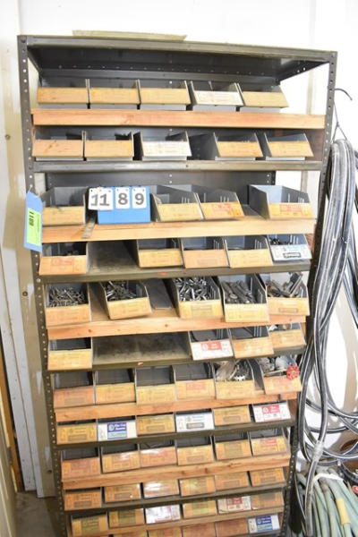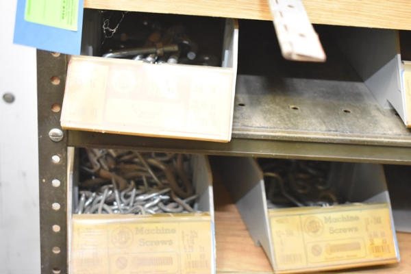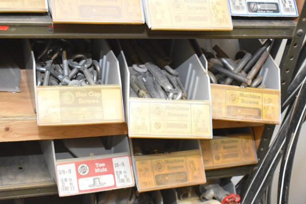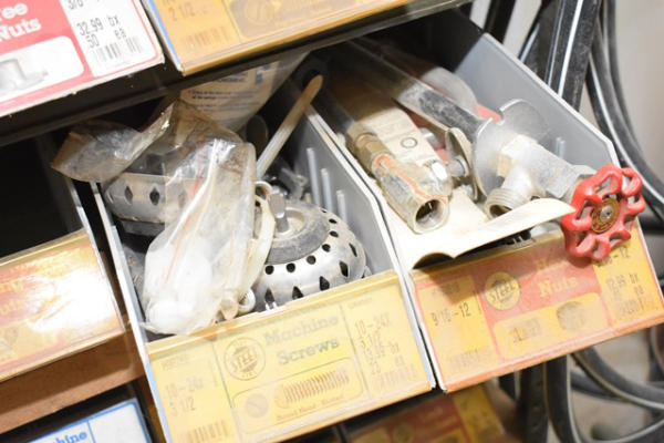 Shelving unit with contents consisting of eye bolts, overhead door rollers, screw hooks, etc.