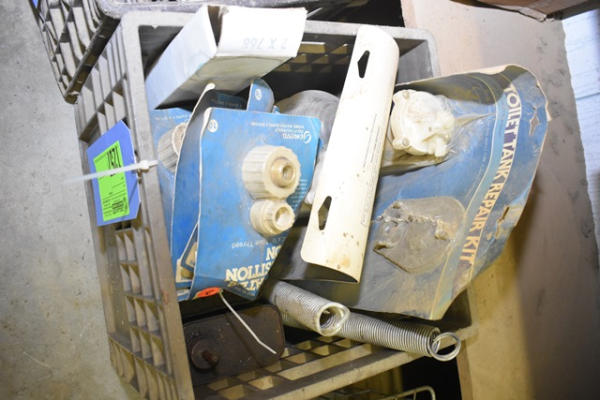 Box lot with toilet tank repair kits, hot water transition union, etc.