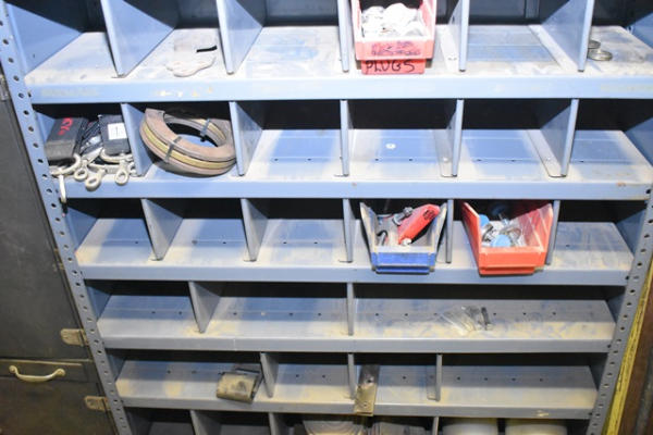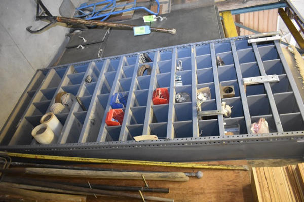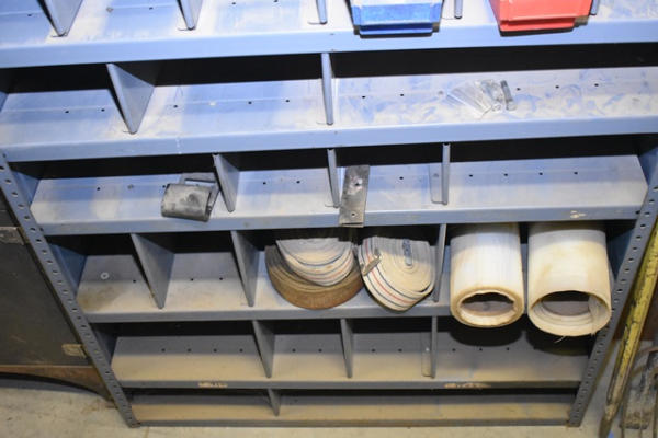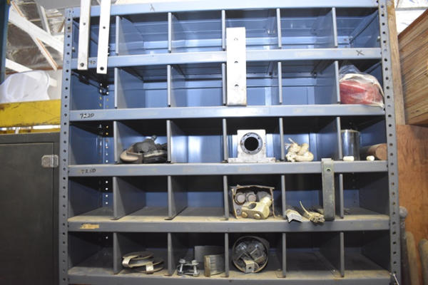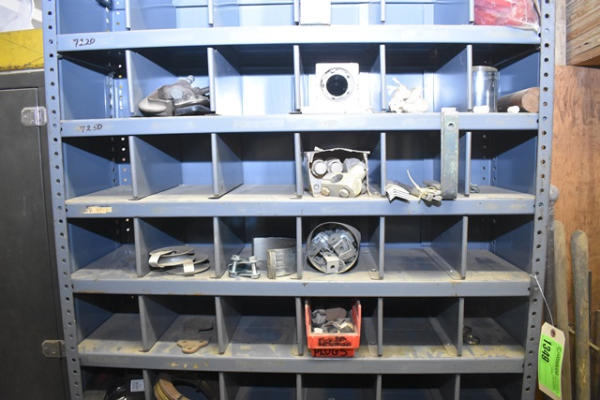 Approx. 7' shelving unit with contents consisting of bracketry, clamp, strapping, etc.
