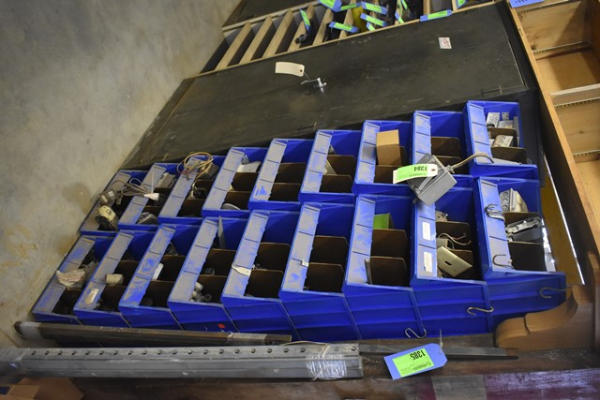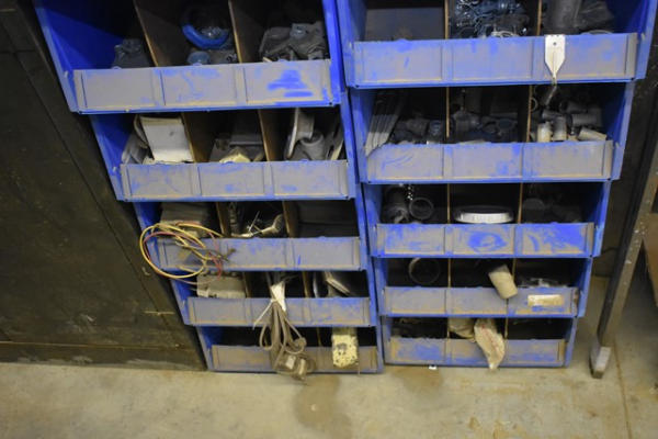 Large parts organizer bin with electrical supplies consisting of boxes, plug ends, conduit connectors, etc.