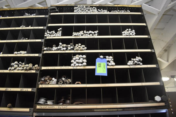 Nut and bolt bin with contents of carriage bolts