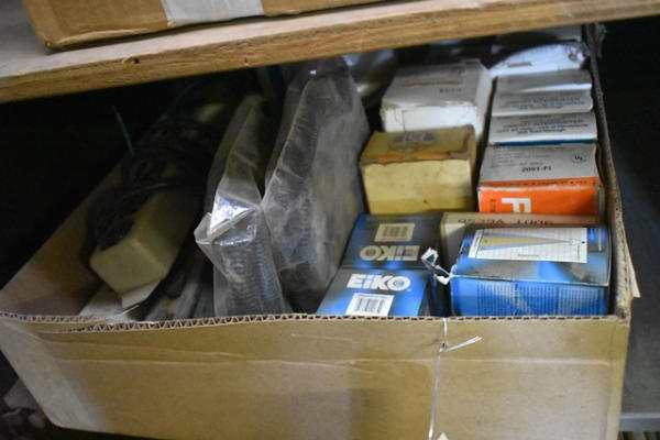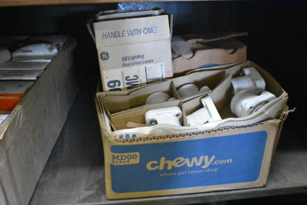 Electrical shelf lot consisting of porcelain sockets, light bulbs, etc.