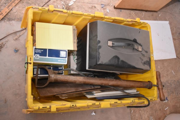Box lot with vintage bicycle pump, office supplies, etc.