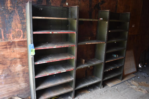 3-bay metal shelving unit, also includes a double section and a single section of shelving