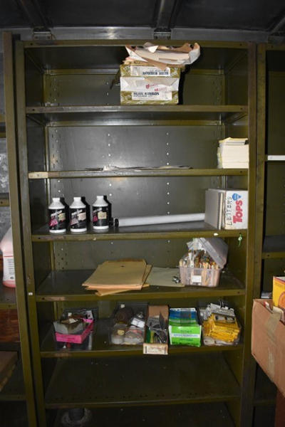 Shelving unit with contents consisting of office supplies, brake fluid, etc.
