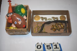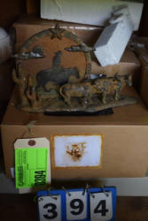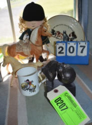 Box lot of knick knacks including horse and carriages in plastic and ceramic