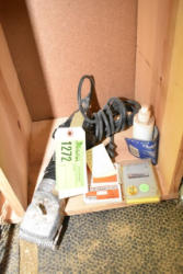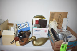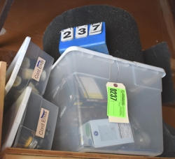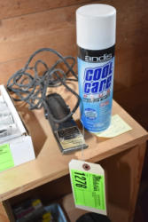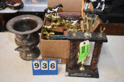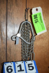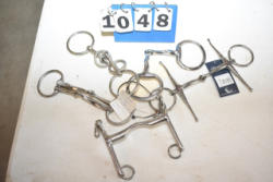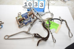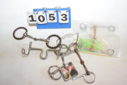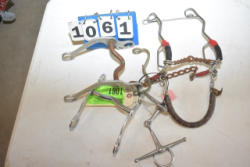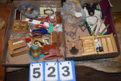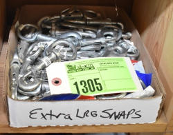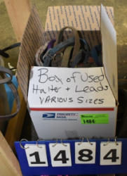 #1535 - Box lot of assorted combs, leather saddle cross, breakaway stirrup, chain hooks, etc.