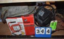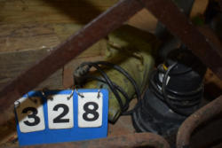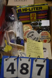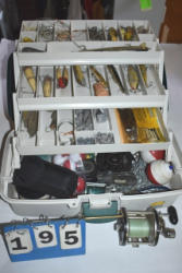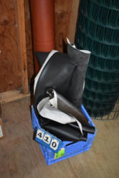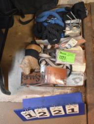 #1497 - Tote lot of shipping and fly boots, Baker fly boots, red shipper, 2 of 2 blue quilt, etc.