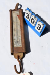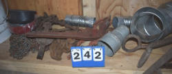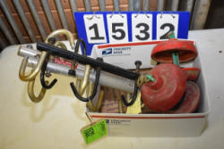 #1530 - Lot of 3 10" large cast iron hooks, 1 5" hook, 1 4" hook and 1 old cow bell